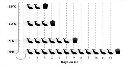 The graph above explains the rates of deterioration of seafood at various temperatures. Seafood stored at 4ºC, for example, deteriorates twice as quickly as seafood stored at 0ºC (0ºC is the temperature of melting ice). Seafood stored at 16ºC, on the other hand, deteriorates approximately six times faster than seafood stored at 0ºC. A cold room is a great place to store freshly caught seafood to maintain the seafood freshness.